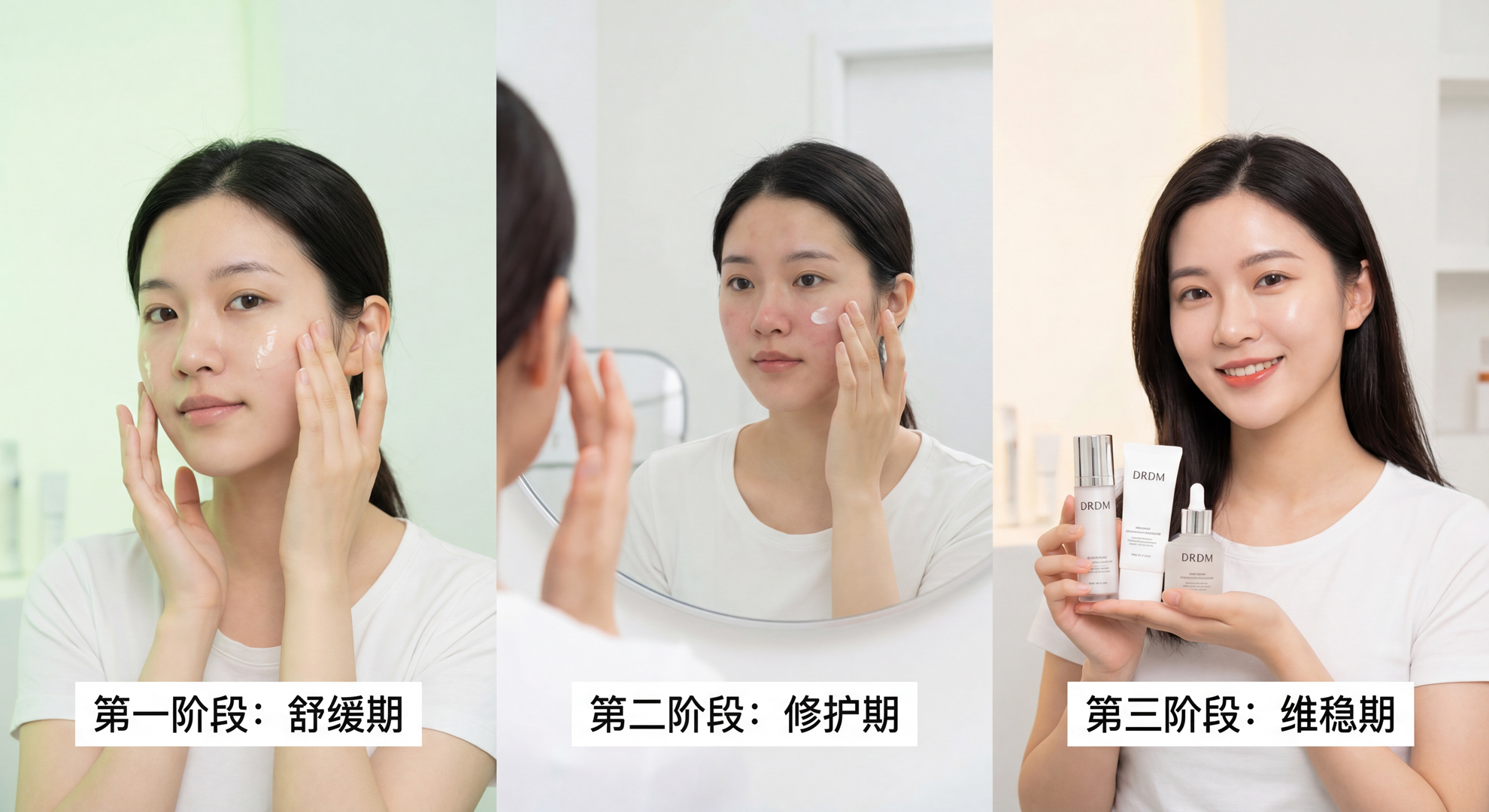 不同于传统“哪里有问题用哪里”的碎片化护肤方式,DRDM的疗程式模型以肌肤阶段变化为核心,根据痘肌在不同时期的表现,将护理路径拆分为舒缓期、修护期与维稳期,并针对每一阶段匹配相应的成分组合与使用策略,帮助肌肤逐步回归稳定状态。